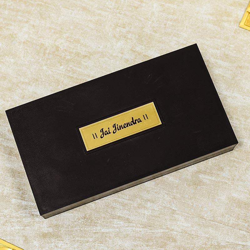 This exquisite pooja box consists of beautiful depictions of the first Tirthankara of Jainism and the art work depicting the gods have been wrapped in 24KT gold foil. The gold wrap is also accompanied by a lacquer coating that helps protect your pooja box from the elements. The box even houses 3 gold foil wrapped plaques. One of which displays auspicious text from the practices and beliefs of Jainism.