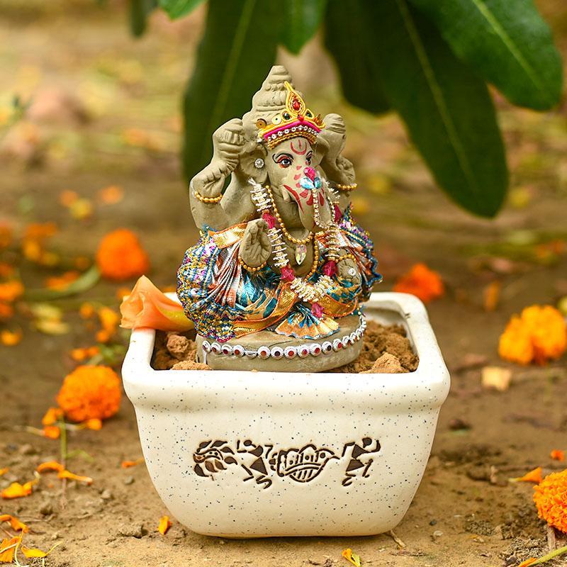 This fantastically decorated eco friendly Ganesha idol has been exclusively curated for this years Ganesh Chaturthi celebrations. The idol has been made using organic clay that contains plant seeds within.