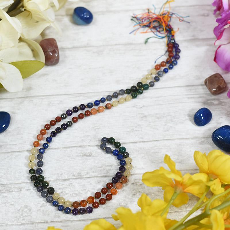 This stunning mala has been made using multiple hues of crystal healing stones that help align all of your chakras. Each color represents one of your 7 chakras and wearing this bead through the day will help channel energy through these chakras in a more positive and efficient manner.