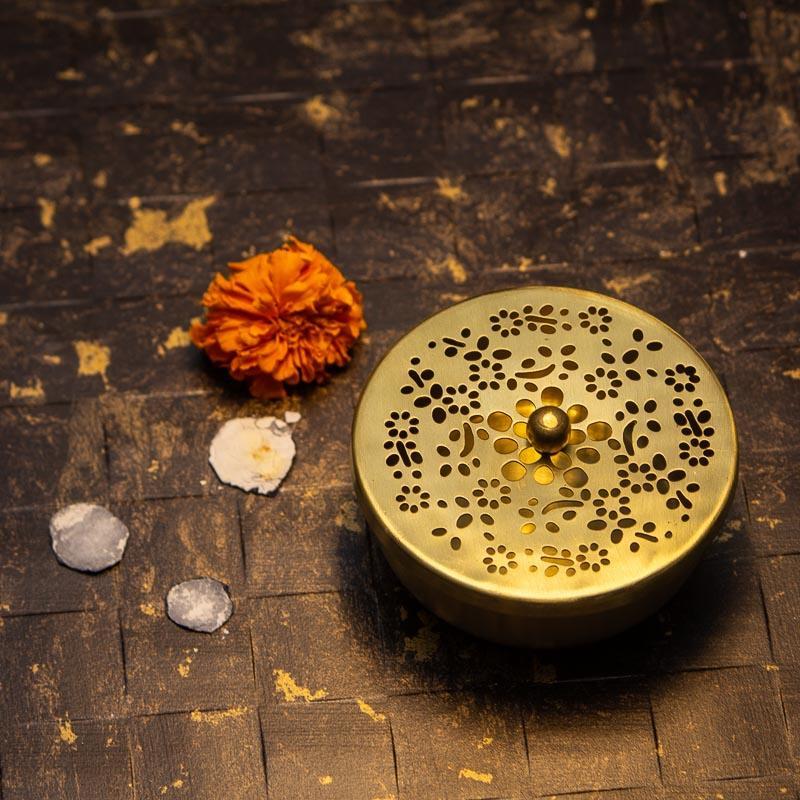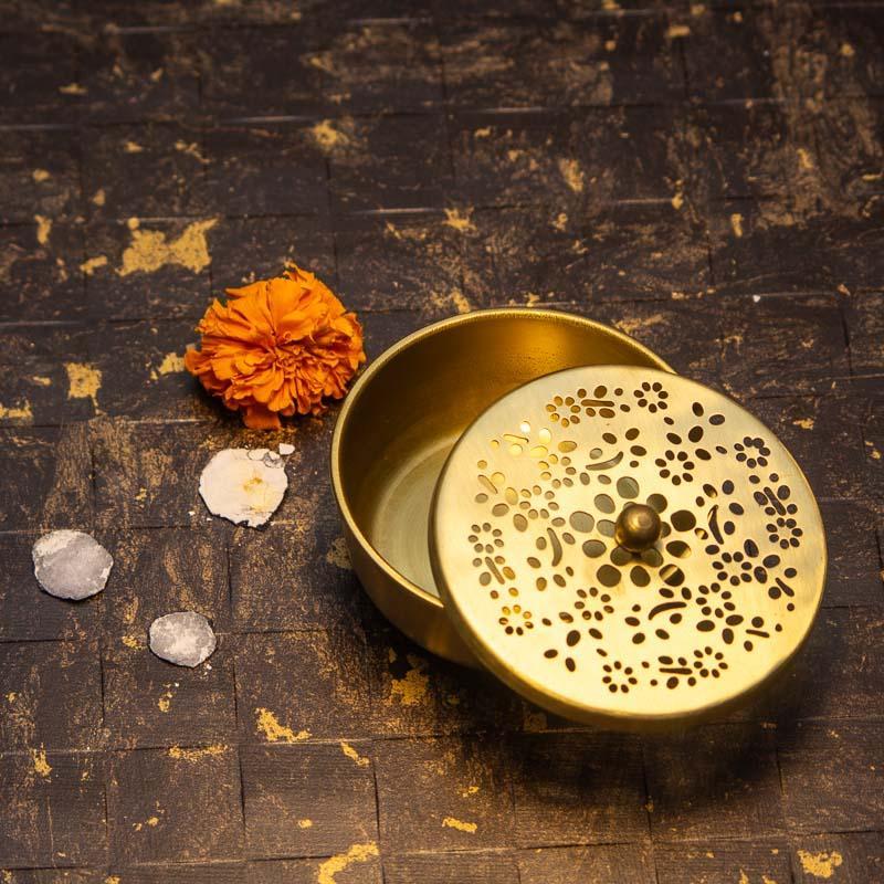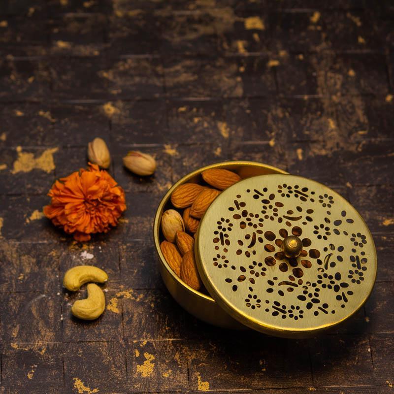 Looking for an antique accent for your dining table or for gifting purpose? This antique handcrafted nut case or container is what you should definitely have. This exquisite container is handcrafted using basic tools. It is made of pure brass sheets. The container comes with a lid with impressive floral pattern all over it.