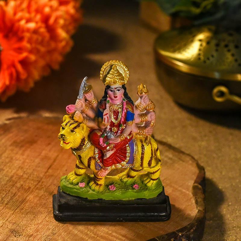 This Maa Durga idol has been made using marble dust and stands out thanks to the vast variety of colors used. Maa Durga has been depicted sitting on top of her tiger in her meditative posture. This idol can be used both at home and at work as religious decor.