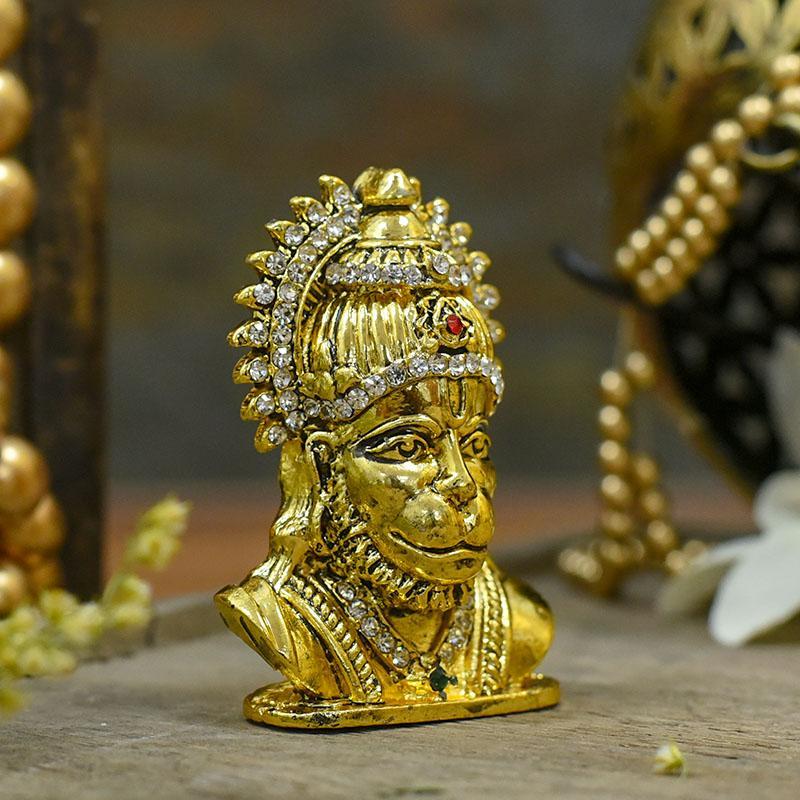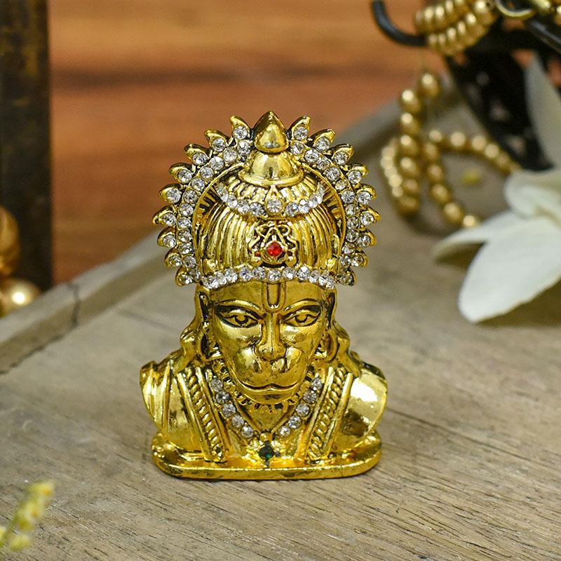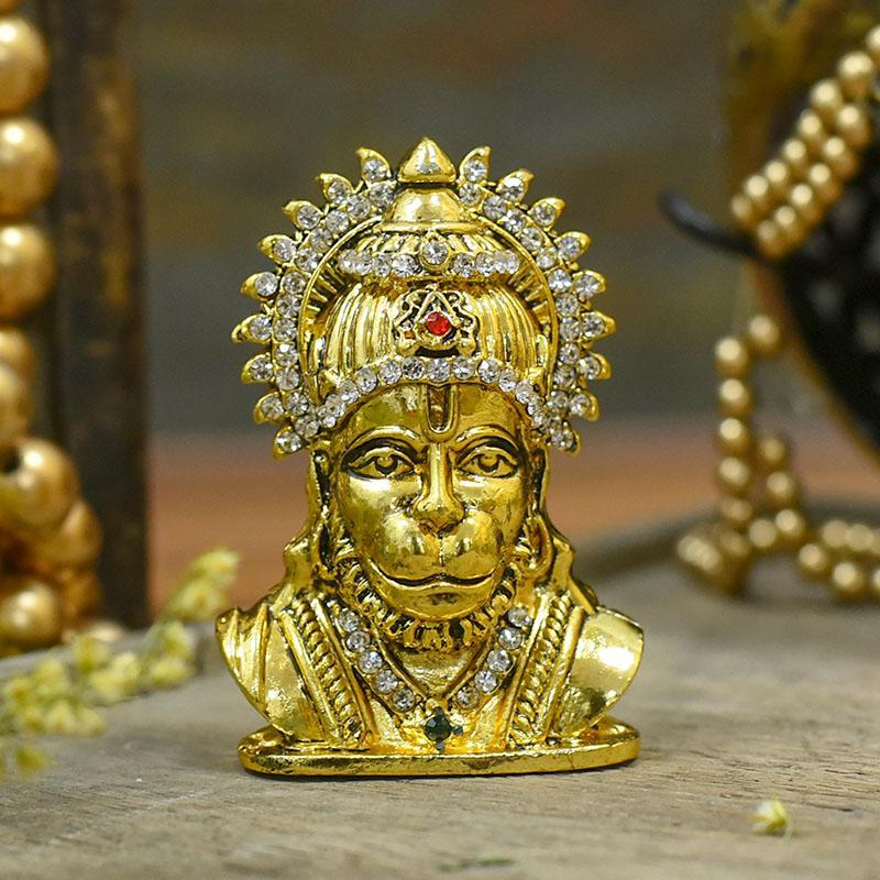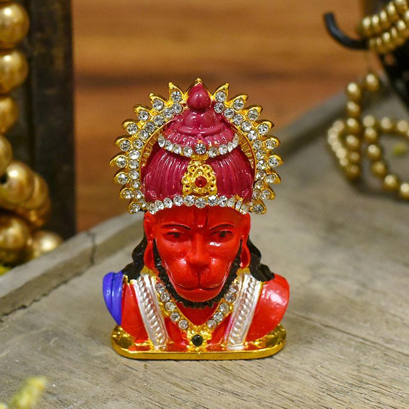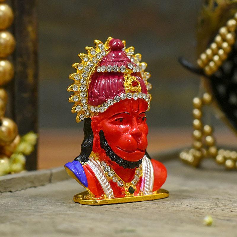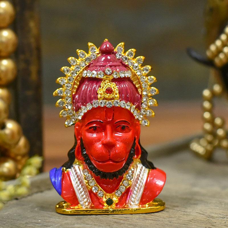 Bring home this figurine featuring Hanuman head. The vibrant red color looks amazing with golden shade and white stone-diamonds studded strategically.