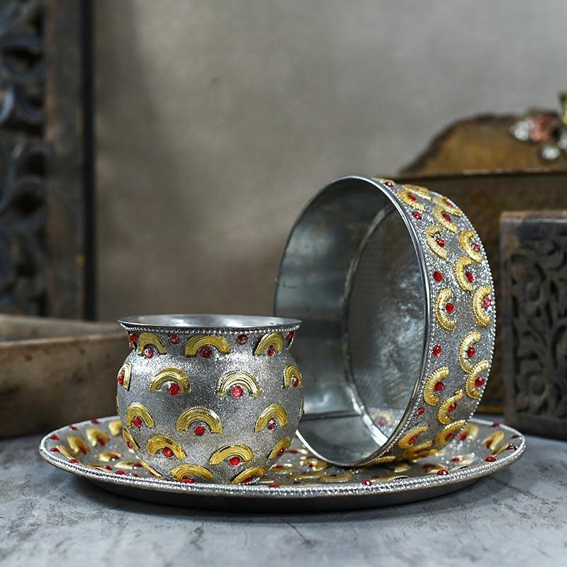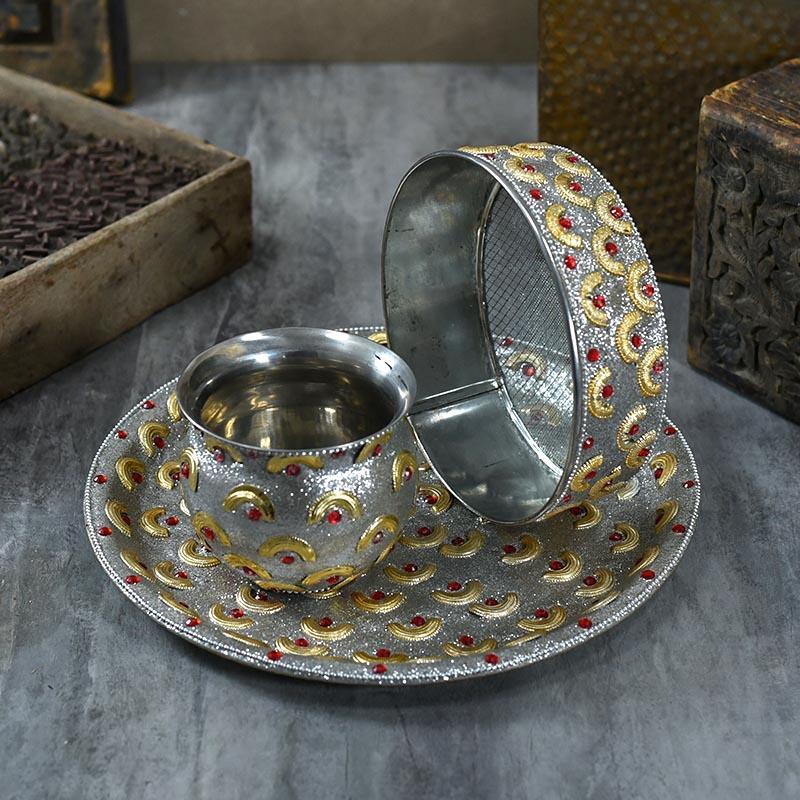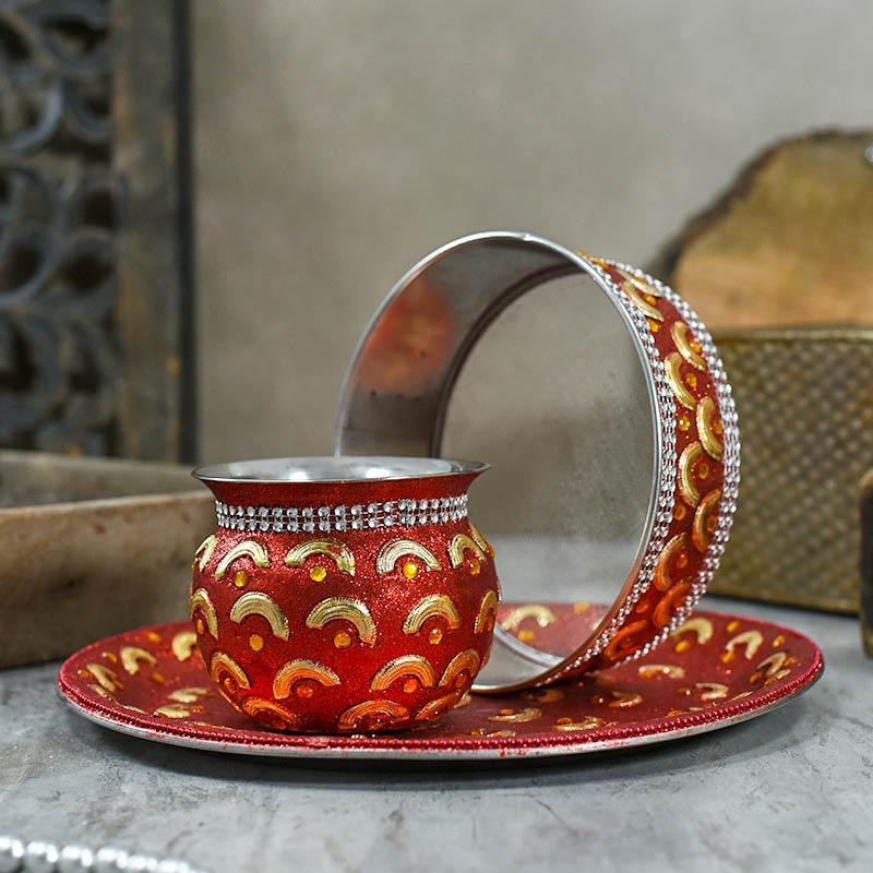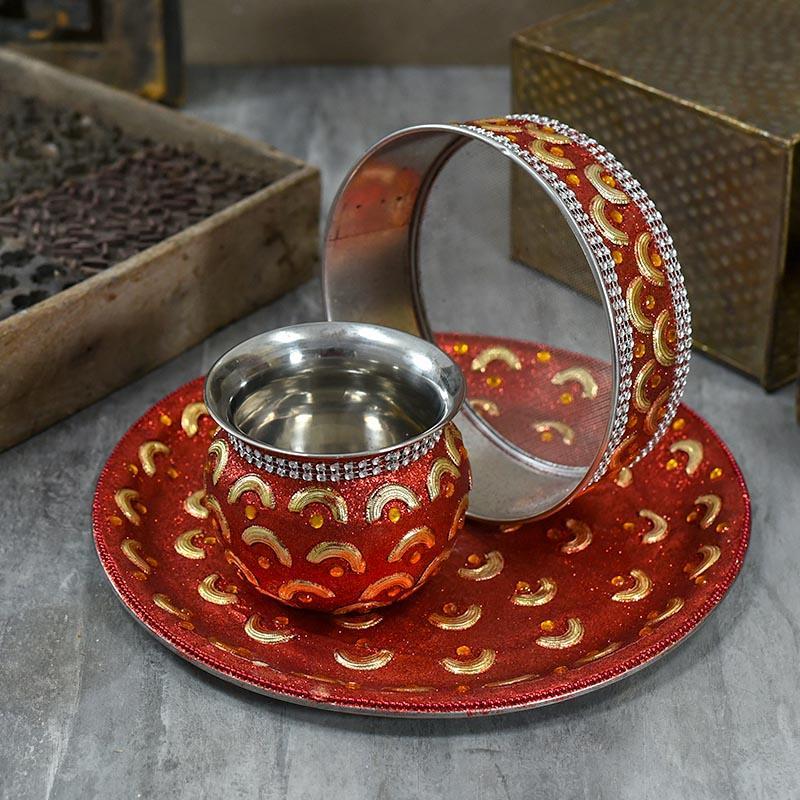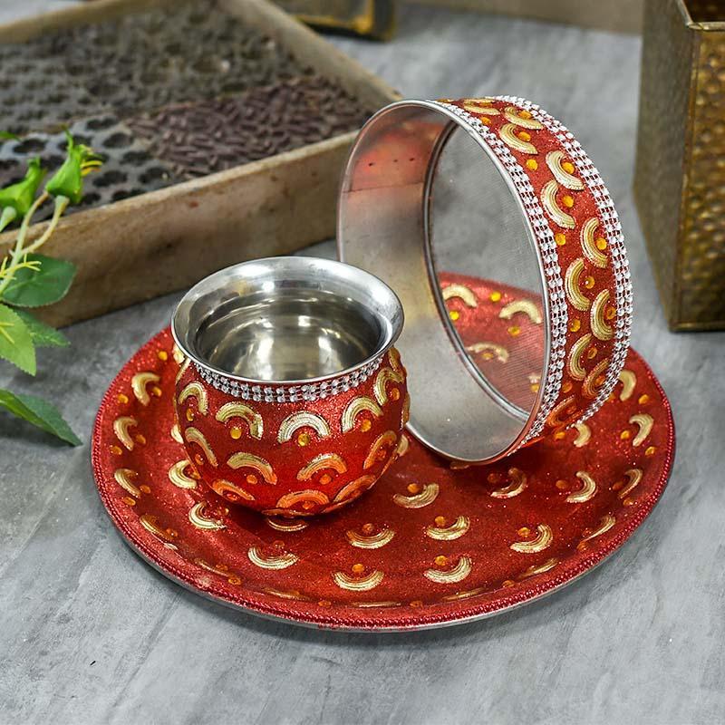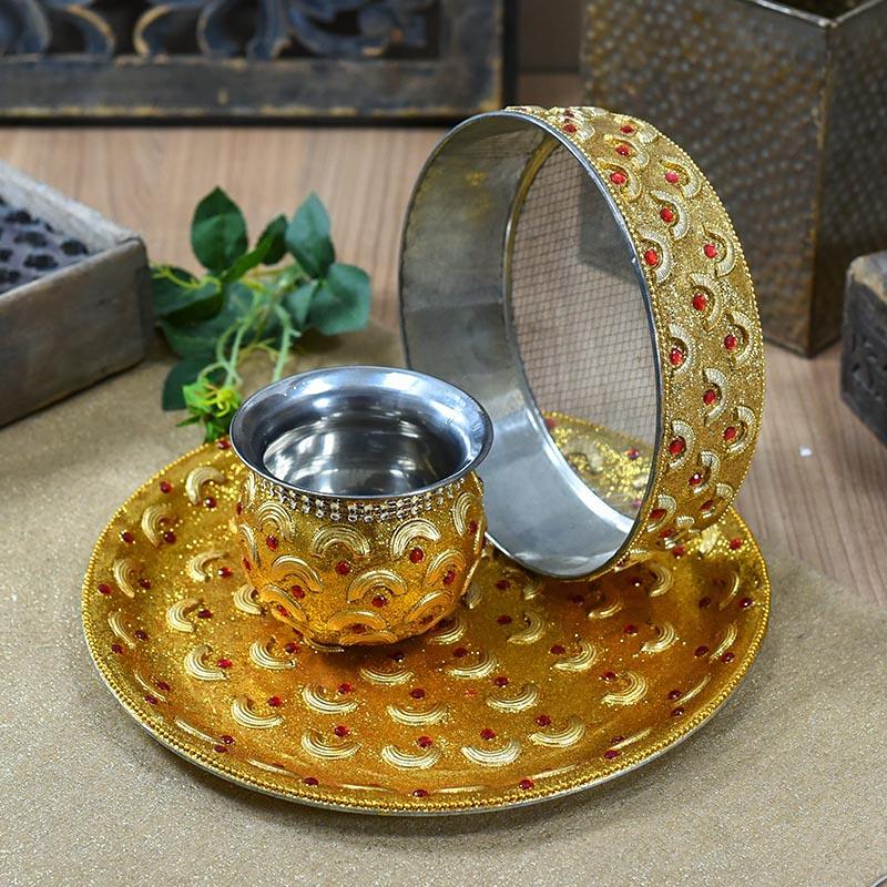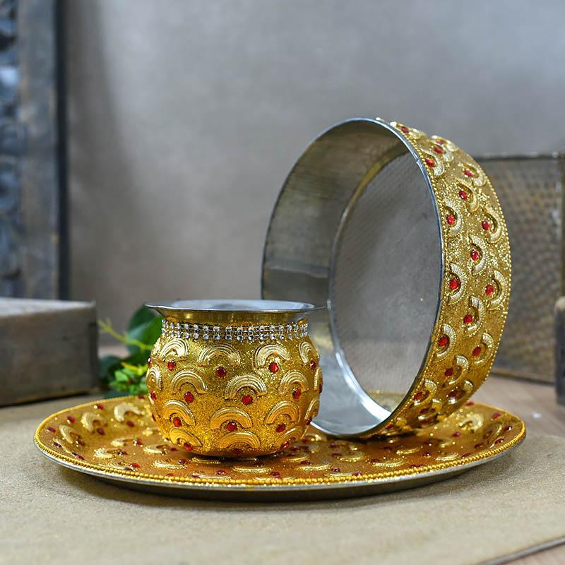 To celebrate the beautiful festival of Karva Chauth, My Pooja Box brings to you a premium Karwa Chauth Thali for you to enjoy this blessed night with the jingling of bangles, twinkling of the stars and honor the prayer of happiness and long life. This sparkling thali will add to the charm of the festival.